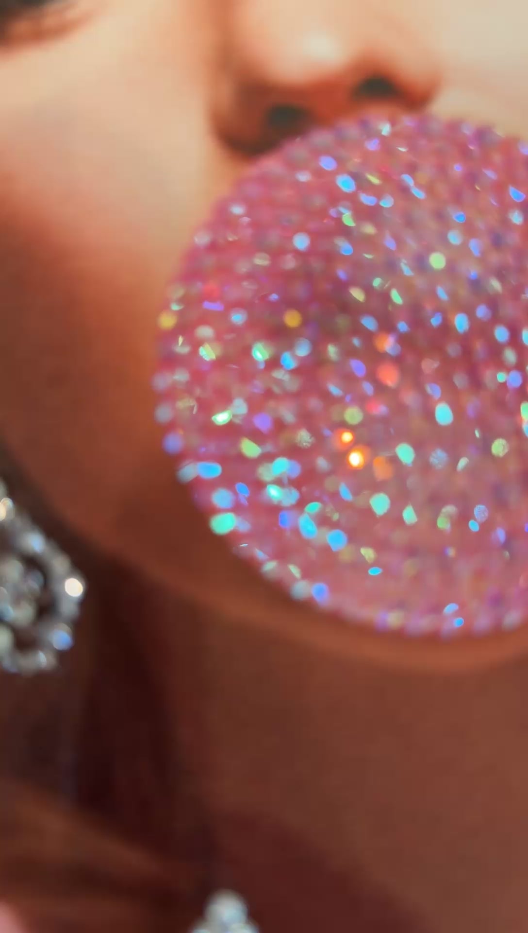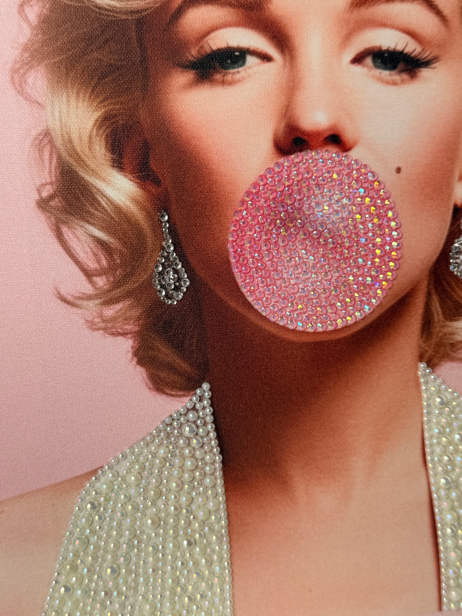 This design takes a classic Hollywood portrait and gives it a bold, modern twist with a statement rhinestone bubble that quite literally steals the spotlight. Soft blush tones meet high-glam sparkle, creating the perfect balance of vintage elegance and playful edge.